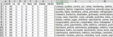 La metodología consiste en recabar las palabras escritas por los estudiantes, organizarlas de forma horizontal en hojas de notas en un formato básico de palabras separadas por comas (Figura 1) y, posteriormente, vaciarlas al programa IDL que procesó, en aproximadamente 25 minutos, los resultados de las 116 encuestas, arrojando los índices como aparecen en la Figura 2.