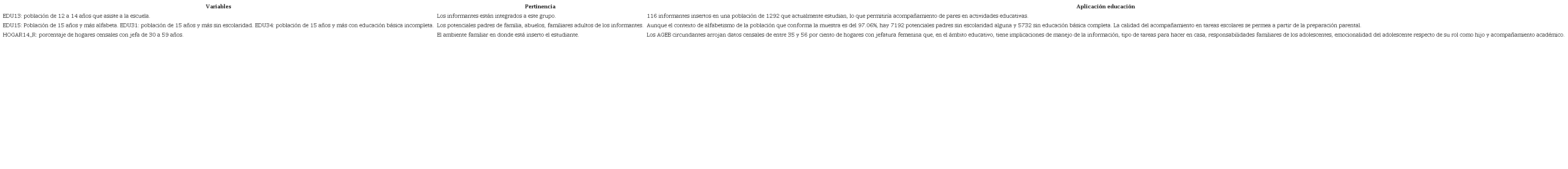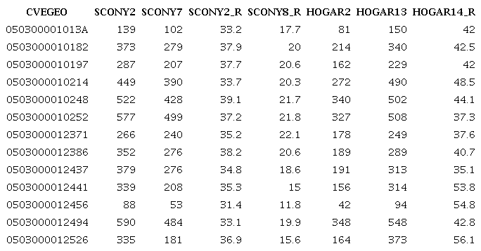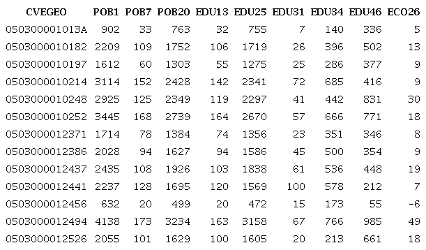 A partir de datos del Censo 2010 de Inegi (2010), se generan las cifras de las Tablas 3 y 4. Este conjunto se conforma de 13 AGEB con una población de 29.446 personas. Se incluyen los siguientes campos: CVEGEO: clave de referencia; POB1: población total; POB7: población de 12 a 14 años; POB20: población de 15 años o más; EDU13: población de 12 a 14 años que asiste a la escuela; EDU15: población de 15 años y más alfabeta; EDU25: población de 15 años y más alfabeta; EDU31: Población masculina de 15 años y más sin escolaridad; EDU34: Población de 15 años y más con educación básica incompleta; EDU46: Población de 25 años y más con al menos un grado aprobado en educación superior; ECO26: población femenina desocupada; SCONY2: población femenina soltera o nunca unida de 12 años y más; SCONY7: población que estuvo casada o unida de 12 años y más, SCONY2_R: porcentaje de población femenina soltera o nunca unida de 12 años y más; SCONY8_R: porcentaje de población femenina que estuvo casada o unida de 12 años y más; HOGAR2: hogares censales con jefatura femenina; HOGAR13: hogares censales con jefa(e) de 30 a 59 años; HOGAR14_R: porcentaje de hogares censales con jefa de 30 a 59 años