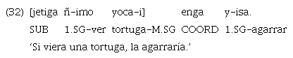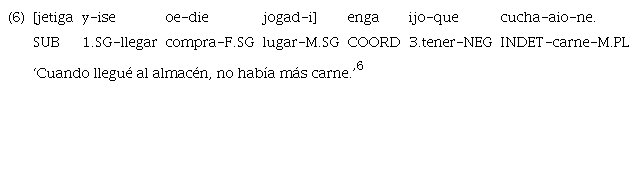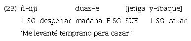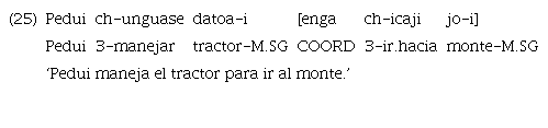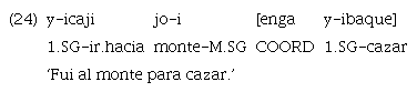 Los anteriores ejemplos destacan frente al resto de los casos de marcación clausal mediante «enga». En este caso, la marca aparece antes de la cláusula incluida y no de la principal, como ocurre en el resto de las instancias de uso de la marca. El orden canónico de esta no se ve alterado, ya que la incluida se encuentra en posición final. Es posible conjeturar, y de ahí la decisión de glosar a «enga» como coordinante, que se trate de una construcción más cercana a la parataxis que las expuestas en 22 y 23. El peso semántico del propósito es expresado mediante el coordinante que, como se ha señalado con anterioridad, suele traducirse como ‘entonces’. De este modo, los ejemplos anteriores podrían leerse también como ‘fui al monte y entonces cacé’ y ‘Pedui maneja el camión y entonces va al monte’, respectivamente.