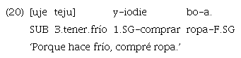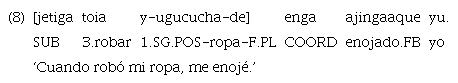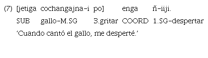 El ejemplo 7 bien podría traducirse como ‘Porque el gallo cantó, me desperté’ y el ejemplo 8 como ‘Porque robó mi ropa, me enojé’. Del mismo modo que en las sucesivas, las temporocausales también muestran exclusivamente el uso del marcador «ujetiga». Las cláusulas temporocausales, además, se construyen con doble marcación. Tomando en cuenta que este tipo de marca es la predilecta para construcciones condicionales y que el coordinante suele traducirse por ‘entonces’, el uso de esta estrategia de doble marcador parece funcionar como un modo de fortalecer la lectura causal de la oración.