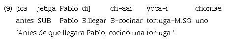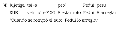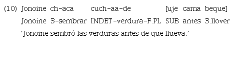Los ejemplos anteriores se construyen con el uso del marcador «uje», aunque, como se señaló al inicio de la sección, el evento no ha ocurrido y, por lo tanto, se esperaría la presencia del subordinante de modo irrealis «ujetiga». En el ejemplo 10 todavía no llovió en el momento en que Jonoine sembró las verduras, mientras que en el ejemplo 11 la acción de comer es posterior al lavado de manos.