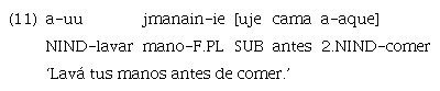 En el ejemplo 9 se observa que la cláusula incluida con significado de anterioridad se encuentra antepuesta a la principal y es encabezada por un adverbio que puede traducirse como ‘antes’ y, luego, el subordinante de irrealis «ujetiga». Sin embargo, también se encuentran casos como los siguientes.