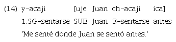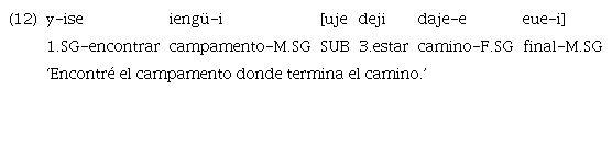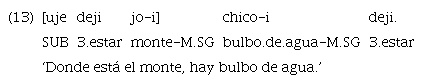 El caso de las locativas es sistemático. En el ejemplo 12 se observa una incluida pospuesta; en el ejemplo 13 esta se encuentra en posición inicial, y en el ejemplo 14 la posición es nuevamente final. En todos los casos, el modo de la subordinada es el de la realidad y se emplea el subordinante de modo realis «uje». Además, en los ejemplos de subordinada antepuesta, la cláusula es activa.