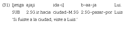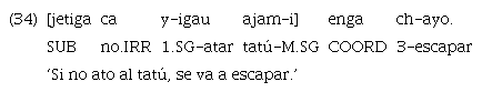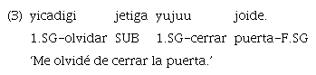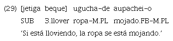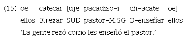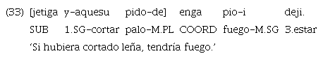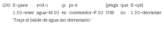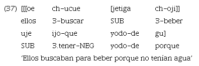 El ejemplo 15 muestra una incluida modal en posición final encabezada por el subordinante realis «uje». Sin embargo, aunque en menor medida, también se encuentran algunos casos de marcación con «ujetiga», justamente en contexto de modo irrealis.