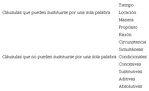 Muchas lenguas permiten configurar la información que suele expresarse con un adverbio, mediante la utilización de una cláusula. Del mismo modo que los adverbios pueden ser caracterizados por los roles semánticos que cumplen, es posible realizar una taxonomía de las cláusulas adverbiales desde esta perspectiva. Además, existe un grupo de cláusulas adverbiales que pueden ser sustituidas por una sola palabra y otro grupo que no. Tomando en cuenta estos parámetros, es posible distinguir los siguientes tipos de cláusulas adverbiales resumidos en la Tabla 1.