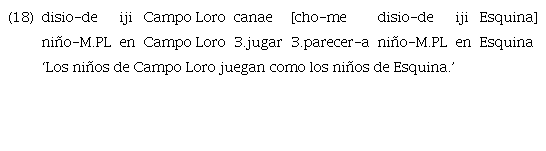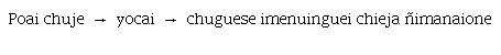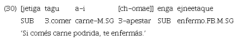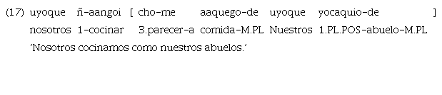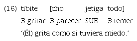 El ejemplo 16 consta de tres verbos («tibite» ‘gritar’, «cho» ‘parecer’ y «todo» ‘temer’) y el subordinante «ujetiga». El segundo de estos verbos, «cho», en este contexto se comporta como una suerte de marcador funcional. Lo encontramos también con la adposición clítica «ome» con un significado traducible por ‘se parece a’ en los ejemplos 17 y 18 que se presentan más abajo. Al no observarse ninguna otra marca de subordinación, la manera se construye mediante el uso de la forma verbal sumada a la adposición.