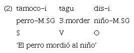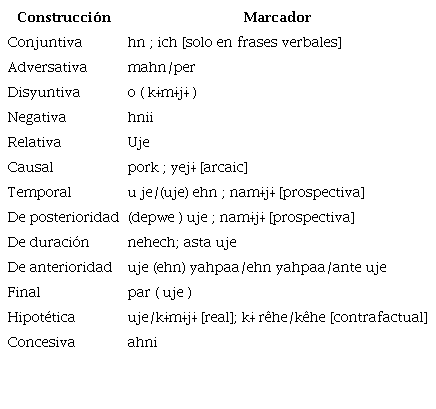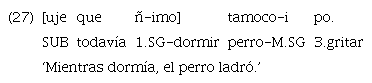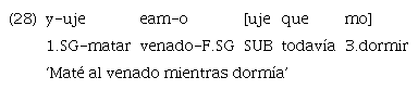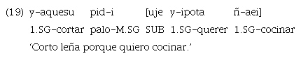 Otro dato importante es el hecho ya expuesto en detalle de que la lengua presenta un conjunto muy limitado de marcadores de subordinación («uje» y «ujetiga», en los casos prototípicos). Según Lehmann (1988), la síndesis es uno de los parámetros para establecer el continuum de integración (Figura 2).