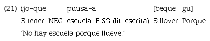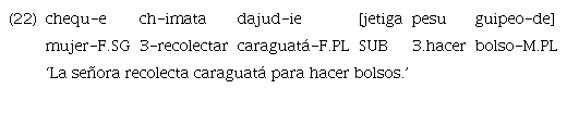 Existe otra estrategia que consiste en una marcación final de la cláusula incluida cuando esta se encuentra en posición final. Para esto, se utiliza el adverbio «gu» que se traduce como ‘por eso’, ‘porque’, como muestra el ejemplo 21.