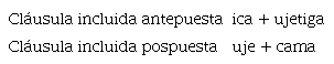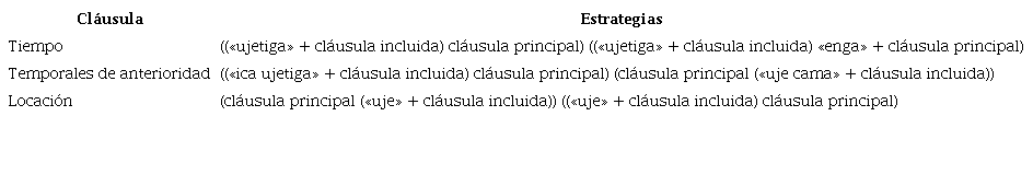 Otro dato que llama la atención es que, si se compara el ejemplo 9 con los ejemplos 10 y 11, las diferencias son claras. En el primero encontramos una cláusula incluida antepuesta y el encabezado «ujetiga» es antecedido por el adverbio temporal «ica». Por otra parte, en los ejemplos 10 y 11 la subordinada se encuentra en posición final y el encabezador «uje» es seguido por el adverbio temporal «cama».