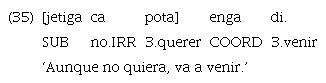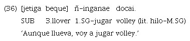 Tanto el ejemplo 35 como el ejemplo 36 muestran cláusulas incluidas en posición inicial. No obstante, en el primero la cláusula principal es introducida por el coordinante «enga», mientras que esto no ocurre en el segundo, que muestra una principal sin ninguna marca de encabezamiento. El uso del coordinante en este tipo de adverbiales parece ser facultativo como refuerzo del significado concesivo de la construcción. Como puede observarse, del mismo modo que con las cláusulas condicionales, la cláusula incluida se encuentra siempre en posición inicial y el adverbio de negación elegido es el de modo irrealis «ca» y no su par de modo realis «que». La variación encontrada en el relevamiento de los datos se da, consecuentemente con el tipo anterior, entre la opción con doble marca o con marcación de la subordinada exclusivamente.