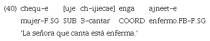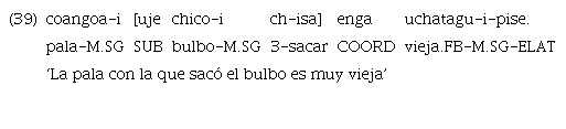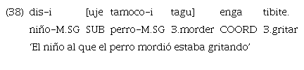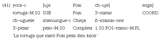 En los anteriores ejemplos de relativas se puede constatar que hay actantes compartidos entre cláusulas: en el ejemplo 40, «cheque» funciona como sujeto de ambas cláusulas. En el ejemplo 41, por su parte, «yocai» es el sujeto de la principal y el objeto directo de la cláusula incluida.