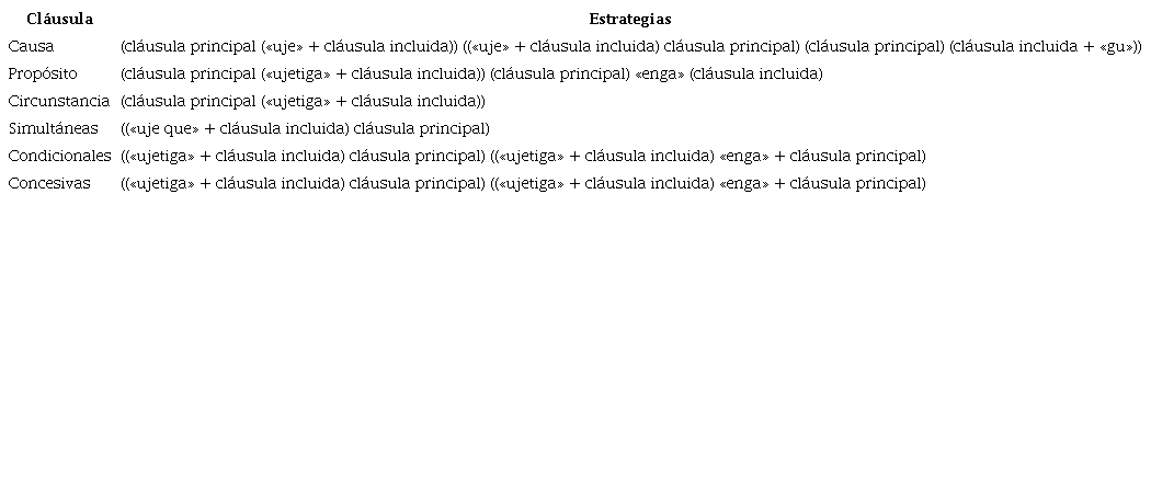 Lo que parece estar ocurriendo, en la línea de lo observado en las adverbiales sucesivas, es que la lengua especifica este tipo de combinación clausal empleando el par «uje-ujetiga», no como marcadores de grado de realidad, sino como marcas específicas de cada tipo de construcción. Se encuentra, entonces, un proceso de gramaticalización análogo al de las sucesivas. En el caso de la anterioridad, se evidencian dos estrategias diferentes como se muestra en la Tabla 2.