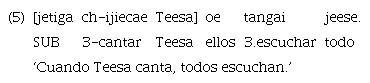 El ejemplo 4 promueve una lectura claramente sucesiva. Para que Pedui arregle el auto, es necesario que primero se descomponga. El ejemplo 5 puede también interpretarse como simultáneo. Sin embargo, el contexto de producción de la emisión favorece la lectura sucesiva. En un espacio público de relativo bullicio se produjo el silencio a causa del comienzo del canto de Teesa5.