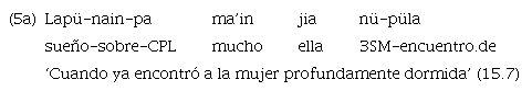 El ejemplo 5a es una cláusula subordinada temporal donde se especifica el momento en que la mujer del viudo ya estaba ‘profundamente dormida’. La preposición «-nain» ‘sobre’ específica contacto o adhesión entre dos entidades y, junto con «lapü», se podría traducir como ‘pegada al sueño’. Siendo subordinada la cláusula, esta carece de sufijos de género-número y, en vez de estos, es marcada como gerundio completivo y así comunica ‘cuando ya estaba pegada al sueño’. El verbo es seguido por el adverbio intensificador y luego el sujeto pronominal. La construcción termina con una preposición que le añade complejidad al estado y justifica la traducción del narrador.