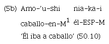 El ejemplo 5b ocurre cuando el viudo ya estaba de regreso en su ranchería en el mundo de los vivos. El narrador usa el predicado ‘caballo-en’ en su forma masculina de presente-pasado para atribuirle una cualidad transitoria al sujeto que le sigue.