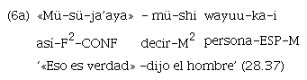El ejemplo 6a es una cita corta confirmativa en un diálogo narrado en el que el viudo muestra estar de acuerdo con los reclamos de Ma’leiwa. El narrador aquí usa ‘ser así’ en su forma femenina confirmativa, sin sujeto expreso por ser sobreentendido, mientras que la citativa está en su frecuente forma estativa masculina y acompañada por el sujeto nominal referente al viudo.
