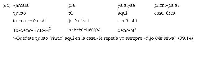 El ejemplo 6b es un párrafo de cita doble que usa tres cláusulas yuxtapuestas para detallar lo que Ma’leiwa le dijo a Pülowi sobre lo que Ma’leiwa le decía al viudo. Con la primera cita, Ma’leiwa le exige quietud al viudo usando una estativa cualitativa en su forma llana que expresa tal mandato. La construcción citativa incrustada en la cita directa está en forma activa transitiva y habitual con sujeto prefijal de primera persona, puntualizando ser el punto de vista de Ma’leiwa, mientras que el sufijo se refiere al viudo quien recibe el mensaje y es, entonces, objeto indirecto. La última citativa está expresa desde el punto de vista del narrador mediante su más frecuente forma estativa masculina y, en este caso, omite el sujeto referente a Ma’leiwa.