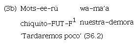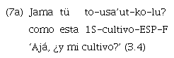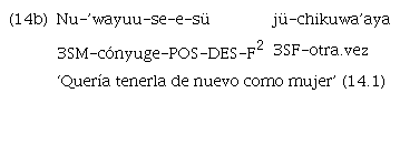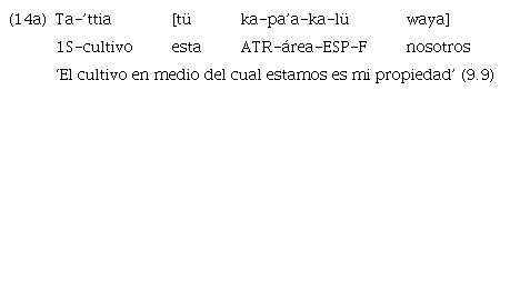Los siguientes ejemplos demuestran la participación de sustantivos poseídos que cumplen esta función configurativa. La cita en el ejemplo 14a es dicha por el alma de la esposa al viudo. Aquí ella le muestra su cultivo y especifica que es propiedad de ella. El predicado ‘ser mi cultivo’ carece de flexión sufijal y el sujeto es la nominalización ‘el área que tenemos’, que presento entre corchetes. Interpreto el estatus morfosintáctico de la poseedora como un sujeto secundario. El ejemplo 14b ocurre cuando el viudo ha estado un tiempo en el más allá con su mujer y aquí expresa las ganas que tiene de tocarla. La predicación de la posesión nominal alienable asume la forma desiderativa femenina para comunicar la incepción del deseo e indicar que el sujeto es ‘ella’. Aquí también considero que el poseedor es una suerte de sujeto secundario.