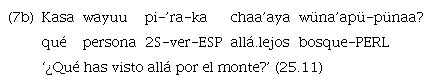 La palabra «kasa» identifica una entidad indefinida no-humana que, en función declarativa, se traduce como ‘algo, cosa’ o ‘animal’, pero en función interrogativa es un ‘qué’. Este pronombre también se combina con «wayuu» para enfatizar la indefinición de tal entidad sin implicar un ser humano (Olza Zubiri & Jusayú, 2012) y ocurre sin flexión alguna. El ejemplo 7b comienza con el predicado «kasa wayuu» y es seguida por el sujeto nominalizado «pi’raka» ‘lo que tú has visto’. Esto se lo pregunta Ma’leiwa al viudo después de haberlo mandado a cazar conejos a un monte en el mundo de los muertos.