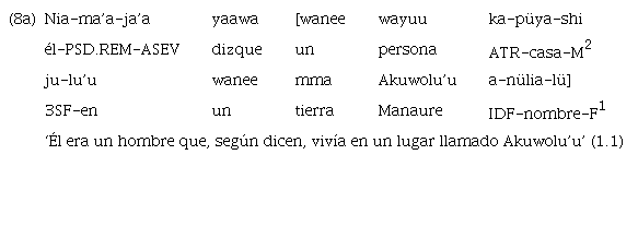 Contrariamente, la predicación de pronombres personales codifica una identidad específica. Como se espera de una narrativa, los de tercera persona singular fueron los más usados en función identificatoria: «jia» ‘ello, ella’ (n50) y «nia» ‘él’ (n13). A pesar de ser un relato con amplio protagonismo de hombres, estos números reflejan la asimetría proporcional existente entre la carga funcional de los géneros. La oración en el ejemplo 8a es la primera de todo el relato. Aquí se introduce al protagonista mediante un predicado pronominal en su forma de pasado remoto y aseverativa, acompañado de un adverbio de evidencia reportativa: «niama’aja’a yaawa» ‘pues según dicen hace mucho tiempo era él’. Este predicado es seguido por el sujeto que presento entre corchetes y consiste en una frase nominal larga ‘un hombre que vivía en una tierra llamada Manaure’.