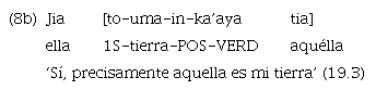 La cita en el ejemplo 8b es precedida por un turno conversacional donde Ma’leiwa le dice al viudo que él lo conoce de Akuwolu’u. Entonces, el viudo le confirma que efectivamente esa es su tierra, usando el predicado «jia» ‘es ella’ en su forma llana. El sujeto es expreso por un nombre alienable poseído, seguido por un demostrativo femenino referente a la zona más lejana al evento de habla.