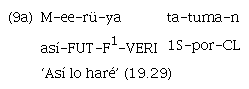 En el ejemplo 9a, el viudo le asegura a Ma’leiwa que le va a obedecer el no cortarse el pelo, las uñas, el bigote, ni la barba. Se usa el predicado «ma-» en la forma futura femenina y verificativa ‘así será’. Esta construcción demuestra una estrategia común de combinar un estado simple con el agente expreso como argumento de la preposición «-tuma-» ‘por’ y así convertirlo en estado resultativo.