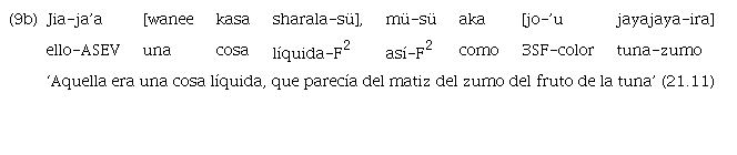 La cita en el ejemplo 9b narra la impresión que tiene el viudo al ver a Ma’leiwa tomarse algo rojo. Esta es una oración de dos cláusulas donde el primer predicado es el pronombre en su forma aseverativa ‘pues ello era’ y el segundo es el verbo comparativo «ma- aka» en su forma femenina. El primero comunica la identidad como ‘una cosa líquida’, mientras que el segundo comunica una semejanza con ‘el matiz del zumo de tuna’.