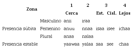 Adicionalmente, existen numerosos verbos que codifican presencia en un espacio definido de manera estable o repentina. La Tabla 1 muestra el sistema de los verbos de presencia que especifican cuatro proximidades al hablante. Estos verbos comunican la presencia estable o súbita de entidades en alguna de estas cuatro inmediaciones. La tercera incluye una variante cislocativa que expresa la moción hacia el hablante traducible como ‘viniendo de allá’ (Olza Zubiri & Jusayú, 2012, p. 333).