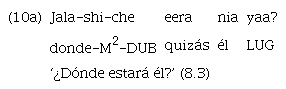 El verbo «jala-» se usa frecuentemente para ubicar alguna entidad. La cita en el ejemplo 10a es una pregunta hecha por los parientes del viudo justo después de haberse vuelto invisible al cruzar al mundo de los muertos. Esta oración presenta al verbo en su forma masculina y dubitativa seguida por el adverbio de incertidumbre y el sujeto pronominal referente al viudo. El elemento «yaa» es una suerte de pronombre de lugar indefinido.