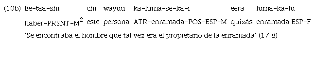 La cita en el ejemplo 11b ocurre cuando el viudo ya está en el más allá. Aquí Ma’leiwa le ofrece chinchorro y ropa al viudo para que se quede en su casa. La oración compleja primero afirma que hay chinchorro y la segunda, que hay ropa mediante dos repeticiones del mismo verbo de presencia súbita femenino y próximo.