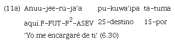 Los verbos de presencia súbita cumplen la importante labor de anunciar nuevos sujetos definidos en el espacio discursivo. En el relato, los verbos de presencia súbita más usados fueron los femeninos de las dos zonas más cercanas: «anuu» ‘aquí está ello, ella’ (n24), y «nnaa» ‘acá está ello, ella’ (n10). Con el ejemplo 11a, el alma de la esposa le cerciora al viudo que ella lo va a cuidar en el mundo de los muertos. El verbo femenino próximo al hablante está en su forma futura femenina y aseverativa, que se podría traducir como ‘pues aquí estará ello’. Este es seguido por el sujeto poseído referente al destino del viudo y finaliza con la preposición causal-agentiva ‘por mí’.