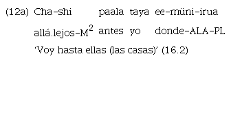 Los verbos de presencia estable más usados fueron el más lejano «cha-» (n19) ‘estar allá lejos’ y el más cercano «yaa-» ‘estar aquí’ (n16). En cierta ocasión el viudo andaba perdido y hablando solo. De repente encuentra unas casas y dice lo que recoge el ejemplo 12a, en el que se usa el verbo en su forma masculina acompañado del adverbio temporal «paala» ‘antes’, que le da un sentido de futuro próximo. Esta frase es seguida por el sujeto pronominal y la palabra ‘hacia donde ellas’.