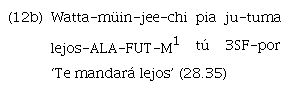 Igualmente, se usaron tres predicados adverbiales con «watta» ‘lejos’ (n17), «peje» ‘cerca’ (n2) y «maalüya» ‘madrugada’ (n1). El ejemplo 12b comunica una presencia potencial en un espacio relativo mediante la predicación del adverbio ‘lejos’ combinado con el direccional alativo, expreso en su forma futura masculina y seguida por el sujeto pronominal. La cláusula es traducible como ‘hacia allá lejos estarás’, pero la preposición causal-agentiva flexionada por ‘ella’, refiriéndose a Pülowi, le añade el sentido resultativo evidente en la traducción activa del español.