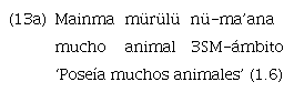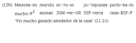 La función cuantitativa (n35) de las construcciones estativas acentúa las cantidades de cosas o seres animados mediante la predicación de adjetivos proporcionales y numerales. El más usado fue «mainma» ‘mucho’ (n25), y también se usó «watta jaalii» ‘bastantes’ (n3), «joulu» (n1) ‘abundante’ y «je’ra» (n1) ‘cuánto’. Por otro lado, se predicaron numerales muy pocas veces: solo hubo dos instancias de «po’loo» ‘diez’, otras dos de «piama» ‘dos’, y una de «wanee» ‘uno’. Las siguientes oraciones comparan el uso de la flexión sufijal en el adjetivo «mainma». En el ejemplo 13a continúa la presentación inicial del protagonista especificando la cantidad de animales que poseía. La cláusula comienza combinando al predicado con el sujeto nominal, ambos en sus formas llanas, y termina con la preposición ‘en ámbito de él’, que es típica de la posesión de nombres alienables (Álvarez, 1996).