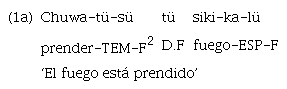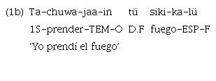 Los siguientes ejemplos comparan el uso de la raíz «-chuwa-» ‘prender’ en ambos tipos de construcciones. Se demuestra la ausencia de la flexión prefijal en el ejemplo 1a y su presencia en el 1b, sufijos temáticos distintos, y sufijos flexivos distintos, aunque ambos se refieran al mismo fuego ‘femenino’.