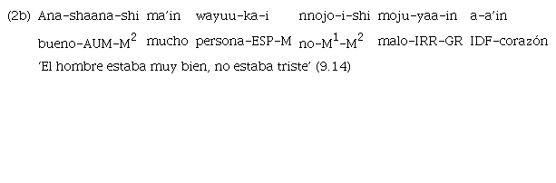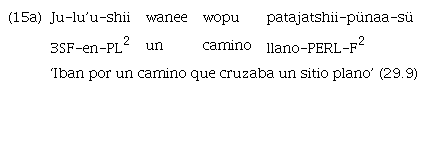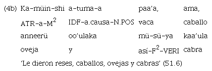 En el ejemplo 4b se presenta una atribución de la preposición «-müin-» ‘a, para’ en una cláusula donde se omite el sujeto temático referente al viudo al que se le designa como ‘regalado de animales’. La preposición indica al beneficiario de una transferencia usualmente en una frase oblicua. La forma masculina del verbo «ka-müin-shi» ‘él tiene para’ es mejor traducida como ‘él es benefactor de’. Al verbo le sigue la preposición causal-agentiva «atumaa» ‘por alguien’ que especifica la existencia de un donante indefinido y caracteriza al estado como télico al implicar el acto previo de ‘dar’ que justifica la traducción activa propia del narrador. La construcción entera comunica la nueva cualidad del viudo como dueño de animales. Esta construcción es narrada hacia el final del relato después de que el viudo hubiera regresado a su comunidad y demuestra lo bien que fue recibido por su gente.