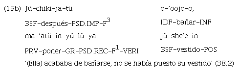 Contrario a la poca repetición de predicados nominales, el número limitado de formas preposicionales causa un poco más de repetición en sus predicados. En el relato se usaron «-lu’u-» ‘en’ (n6), «-ma’ana-» ‘ámbito’ (n4) y «-nain-» ‘en, sobre’ (n3), entre otras. Los siguientes ejemplos demuestran la participación de preposiciones flexionadas en función configurativa. La oración en el ejemplo 15a especifica el trayecto que tomaron Ma’leiwa y el viudo durante un viaje que hicieron. Aquí se expresa la preposición flexionada ‘en ello’ en su forma plural animada y con sujeto temático omiso referente a ‘ellos dos’. Por su parte, el prefijo femenino se refiere al argumento nominal ‘un camino que cruzaba llanos’ aquí interpretado como un sujeto secundario. Por otro lado, el ejemplo 15b consiste en dos cláusulas estativas que narran lo que el viudo vio una vez que se puso a espiar a la mujer Pülowi. En la primera, la preposición ‘después de ello’ es predicada en su forma de pasado imperfecto femenino indicando que el sujeto temático omiso es Pülowi, mientras que el prefijo femenino concuerda con la actividad de ‘bañarse’, que aquí es el sujeto secundario. En la segunda cláusula, el predicado es la privativa ‘no tener puesta su ropa’ expreso en la forma de pasado reciente femenino, indicando otra vez que el sujeto temático y omiso es la misma Pülowi.