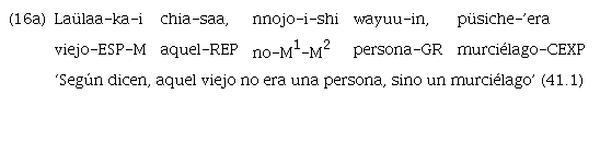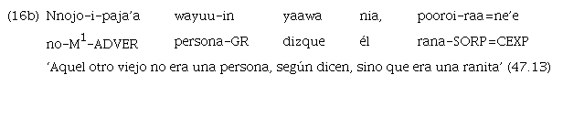 En el relato se traspasan mundos en el que el protagonista sufre repetidas visiones alternas que obligan al narrador a aclarar identidades categóricas repetidamente. En los ejemplos 16a y b, Jusayú aclara que los viejos con los que el viudo había interactuado eran en realidad animales. El ejemplo 16a muestra un sujeto topicalizado, que precisa una pausa antes de los dos predicados aclarativos. El primero se expresa con una negación masculina seguida de la forma subordinada del ‘ser humano’, mientras que el segundo simplemente se flexiona como un predicado contraexpectativo. En el ejemplo 16b también vemos la secuencia negación-afirmación, donde la negación se expresa en forma masculina adversativa combinada con la forma subordinada del ‘ser humano’ y el adverbio reportativo, mientras que la afirmación ‘era rana’ se expresa en su forma sorpresiva y contraexpectativa.