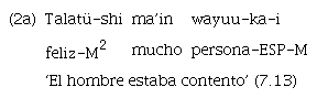 Adicionalmente, el ejemplo 1a demuestra la inexistencia en wayuunaiki de una palabra cópula comparable al verbo estar del español. En vez de esto, la cláusula estativa consiste prototípicamente en la simple yuxtaposición de predicado y sujeto. La posición inicial en la cláusula es estrictamente predicativa y, por esto, no solo los verbos la empiezan, sino que también lo hacen los nombres, pronombres, preposiciones y adjetivos sin morfología verbalizadora alguna.