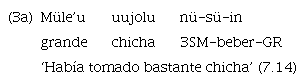 La existencia de adjetivos como clase de palabra en wayuunaiki ha sido definida como aquellas palabras que no concuerdan en género-número y pueden ser predicados en su forma llana en presentepasado (Ehrman, 1972; Álvarez, 2017). Este es un grupo de palabras muy pequeño que expresa calidad y cantidad. En el relato sobresale el uso de las cualitativas «müle’u» ‘grande’ (n6) y «motsa» ‘chiquito’ (n5). No obstante, también se identificaron adjetivizaciones que sí se flexionan por género-número como «waneeje-» ‘distinto, extraño, raro’ (n4). La construcción en el ejemplo 3a se narra justo antes de la partida del viudo y el alma de su mujer hacia el mundo de los muertos. Esta muestra el ‘ser grande’ en su forma llana, designando la cualidad del sujeto ‘chicha que él bebió’. Este sujeto contiene el gerundio de ‘beber’ en posición adjetival. En el ejemplo 3b vemos la predicación del adjetivo en su forma futura femenina que le atribuye la cualidad de ‘corto’ al sujeto poseído ‘nuestro-rato’. Esto se lo dice Ma’leiwa al viudo para animarlo a ir a ver los animales que le pensaba regalar.