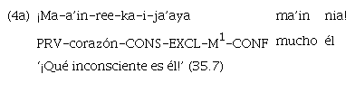 Las verbalizaciones se realizaron mediante la prefijación del atributivo «ka-» (n63) o el privativo «ma-» (n22) a nombres (n73), acciones nominalizadas (n11) y preposiciones (n6). Los prefijos atributivos y privativos derivan verbos estativos con los significados ‘tener’ y ‘carecer’, respectivamente. En el ejemplo 4a, Ma’leiwa reacciona al ver que el viudo desobedece otra vez la orden de no visitar a su mujer y, entonces, lo juzga como inconsciente. El nombre wayuu «-a’in-» pinta el corazón en un sentido amplio que incluye mente y alma. Por eso, el verbo «ma-a’in-» ‘ser descorazonado’ es mejor traducido como ‘desatento’ o ‘loco’; aquí se usa en forma consecuencial, exclamativa masculina y confirmativa, seguida por un intensificador y el sujeto pronominal.