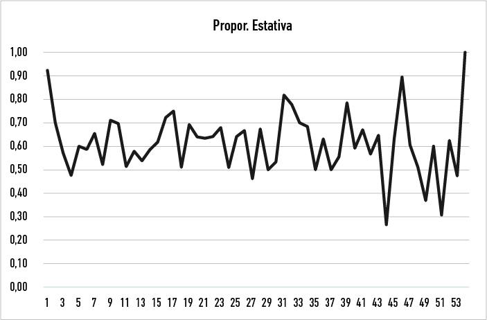 «Relato del hombre cuya mujer murió» está compuesto por 1964 construcciones predicativas. De estas, 1205 son estativas y 759 activas. Es decir, el 61.4% del relato lo componen construcciones dedicadas al establecimiento del fondo del relato que describe la naturaleza de los participantes y su entorno espaciotemporal. La alternancia entre construcciones estativas y activas no siempre ocurre en el mismo ritmo. La proporción de construcciones estativas respecto a las activas no es igual en cada párrafo, y tiene un clímax entre los párrafos 43 a 49, donde se exagera tanto el aumento de actividades como el aumento de estados. Este clímax corresponde a un incremento productivo del viudo cuando se dedica a tejer muchas obras y un consecuente sosiego en su entorno, descrito como una nueva vida. Luego vuelven a aumentar las actividades requeridas para llevar a cabo el regreso al mundo de los vivos. La Figura 1 muestra la proporción del uso de cláusulas estativas en cada párrafo del relato. Se puede ver que las estativas constituyen variablemente entre el 50% y el 75% de cada párrafo, marcados por un principio y fin con uso exagerado de estados.
