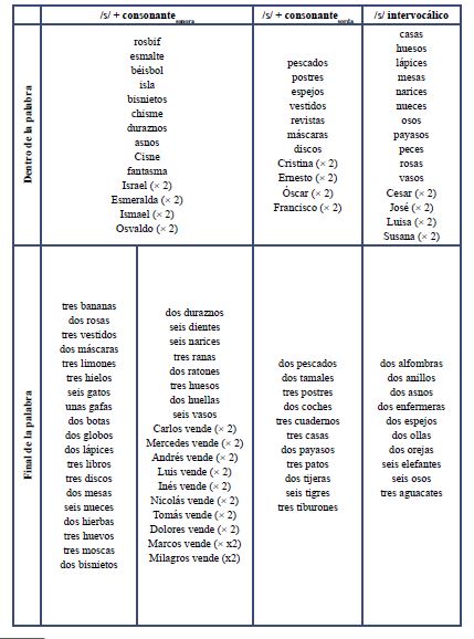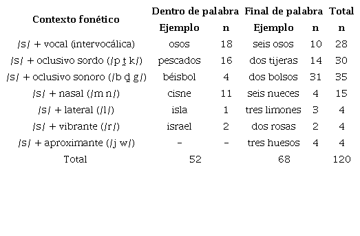 Hubo un total de 120 casos posibles de /s/ por participante. No todos los participantes realizaron todos los casos (por ejemplo, por equivocación de un ítem léxico). Los casos incluyeron los contextos fonéticos de /s/ seguida por una consonante sonora, por una consonante sorda y por una vocal, tanto en posición interior de palabra como final de palabra. Se presentan ejemplos de los diferentes contextos en la Tabla 1 (véase el Apéndice para una lista completa de los ítemes inluidos en la tarea experimental). En total, se analizaron 1230 casos de /s/.