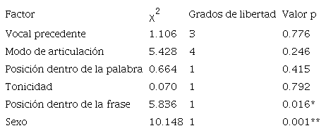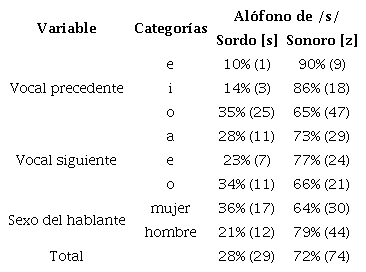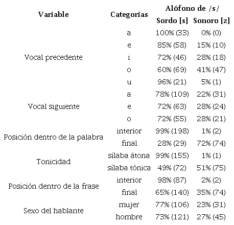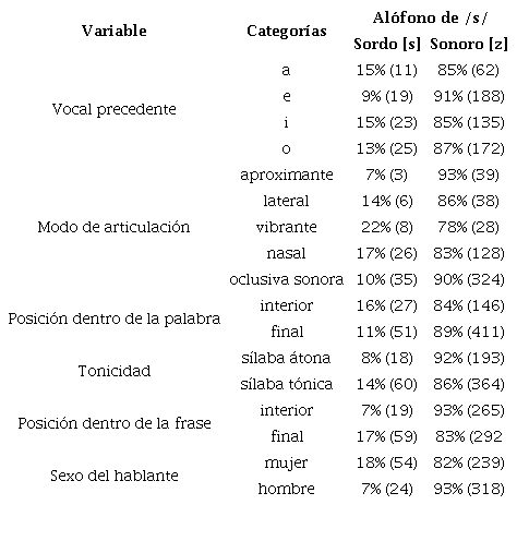Se hicieron análisis estadísticos usando el modelo de EEG, usando la clasificación binaria de la sonorización (alófono sordo [s] o sonoro [z]) como la variable dependiente. Los factores incluidos en el modelo fueron vocal precedente, modo de articulación de la consonante siguiente, tonicidad, posición de /s/ dentro de la palabra, posición dentro de la frase y sexo del hablante. Los resultados del análisis descriptivo de los factores estudiados se presentan en la Tabla 3. Por ejemplo, para el factor de vocal precedente, cuando /s/ fue precedida por la vocal /a/, se sonorizó ([z]) en el 85% de los contextos y no se sonorizó ([s]) en el 15% de los casos.