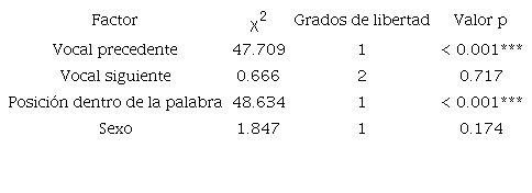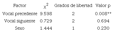 Se volvió a implementar el análisis estadístico usando el procedimiento de las EEG, pero en este caso solo se incluyeron los casos de /s/ intervocálica en posición final de la palabra. Se especificó la clasificación binaria de la sonorización (alófono sordo [s] o sonoro [z]) como la variable dependiente y la vocal precedente, la vocal siguiente y el sexo del hablante como los factores en el modelo. Otra vez, la vocal precedente resultó ser un factor significativo en el modelo (Tabla 8).