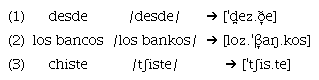 En español, /s/ en posición final de la sílaba puede pasar por un proceso de asimilación regresiva1 de sonorización cuando es seguida por una consonante sonora (Hualde, 2014; Quilis, 1999), en el que las cuerdas vocales empiezan a vibrar al articular /s/ en anticipación a la sonoridad de la consonante siguiente, resultando en un cambio fonético2. La sonorización de la sibilante se aplica tanto dentro de la palabra (como se ve en el ejemplo 1) como entre palabras (como se ve en el ejemplo 2). En contraste, /s/ mantiene el rasgo sordo cuando va seguida por una consonante sorda (como se ve en el ejemplo 3):