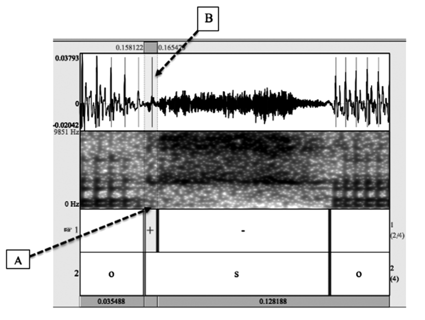 Por ejemplo, en la Figura 1, se observa que en la palabra «osos» solo al inicio del fonema sibilante intervocálico hay barra de sonoridad (A) y periodicidad (B) durante los primeros 7 ms del sibilante (marcado con un «+»), resultando en un porcentaje de sonorización de un 7% (7 ms/102 ms). En este caso, el alófono fue codificado como sordo [s].