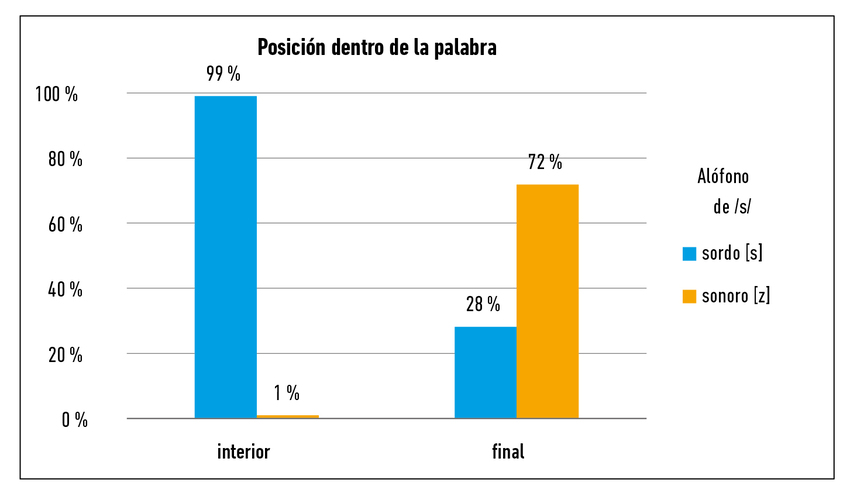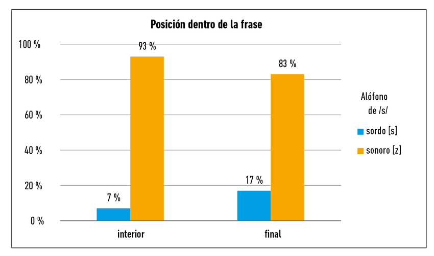 En cuanto a la posición dentro de palabra (por ejemplo, en «osos»), los hablantes quiteños prácticamente nunca sonorizan /s/ intervocálica, mientras que en posición final de palabra (por ejemplo, en «tres osos»), la mayoría de las variantes de /s/ intervocálica eran sonoras [z] (Figura 4).