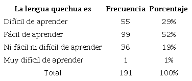 Sin embargo, a la pregunta sobre si la lengua quechua es fácil o difícil de aprender (Tabla 10), la mayoría de los entrevistados opinó favorablemente y consideró que el quechua es una lengua fácil de aprender (52%). Un buen porcentaje de ellos (29%) la consideró una lengua de difícil aprendizaje.