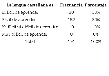 La valoración positiva del castellano en una comunidad bilingüe tiene que ver con los valores y prejuicios imperantes. El 80% opinó que la lengua castellana es fácil de aprender. Ninguno consideró su posible dificultad (0%). Estos resultados van de la mano con los valores dominantes en la sociedad, donde la «lengua castellana es la lengua mejor valorada por la enorme mayoría de personas y las lenguas originarias del Perú son consideradas inferiores» (Pérez Silva, 2004, p. 74). La valoración positiva recae en el castellano: es una lengua formal, de la ciudad, con acceso escolar para su aprendizaje y de proyección mundial; en contraposición, la lengua quechua representa la suma de la valoración negativa: es una lengua socialmente disminuida, de empleo restringido, propia de un grupo minoritario y de escasa proyección mundial.
